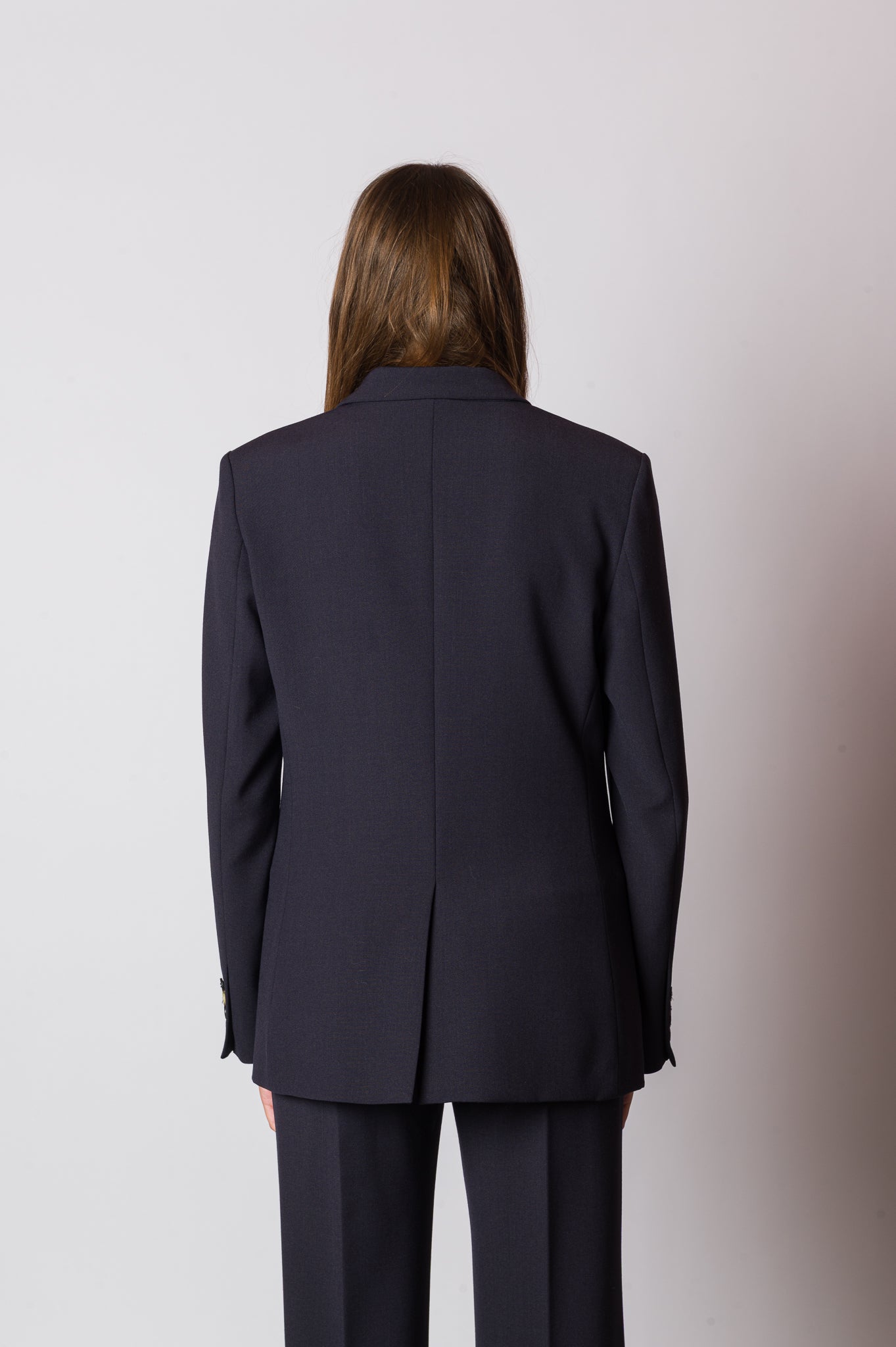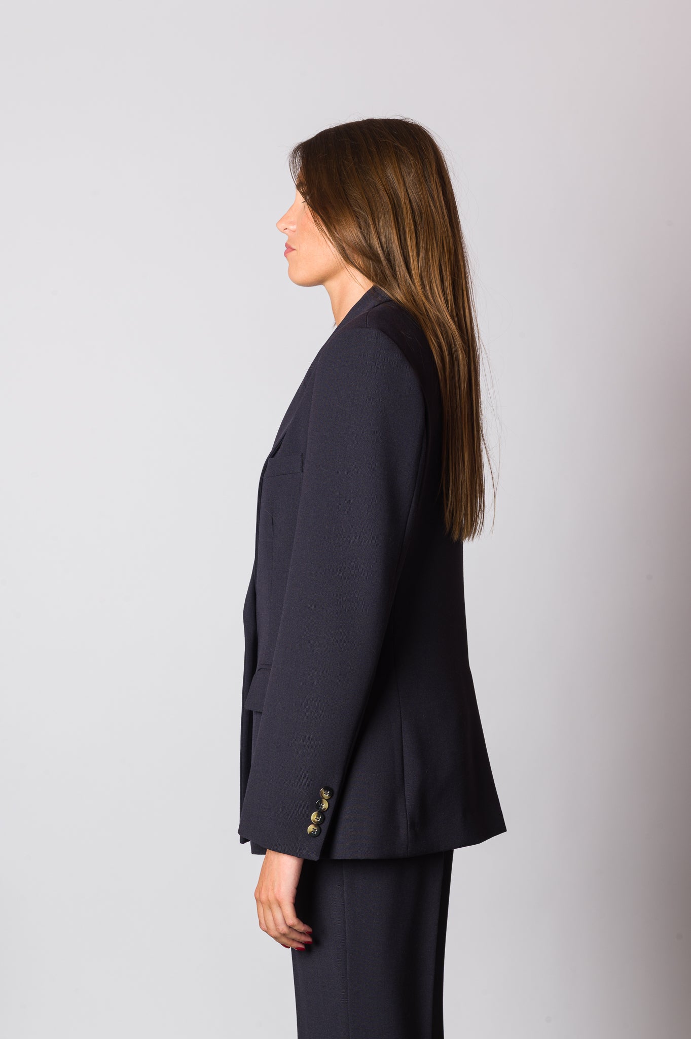La giacca in lana monopetto blu navy è un capo essenziale del guardaroba femminile, pensato per chi ama l’eleganza senza tempo con un tocco moderno. Il modello presenta un taglio regular fit, che assicura comfort e armonia alla silhouette, con linee leggermente slim per valorizzare le forme. Il rever a lancia regala un’allure sartoriale, mentre il bottone effetto corno diventa un dettaglio ricercato e distintivo. Le tasche a pattina completano il design, rendendo questa giacca perfetta da indossare sia in ufficio con pantaloni sartoriali, sia nel tempo libero con denim e maglieria. Un capo versatile, elegante e intramontabile, ideale per accompagnare ogni stagione con stile.