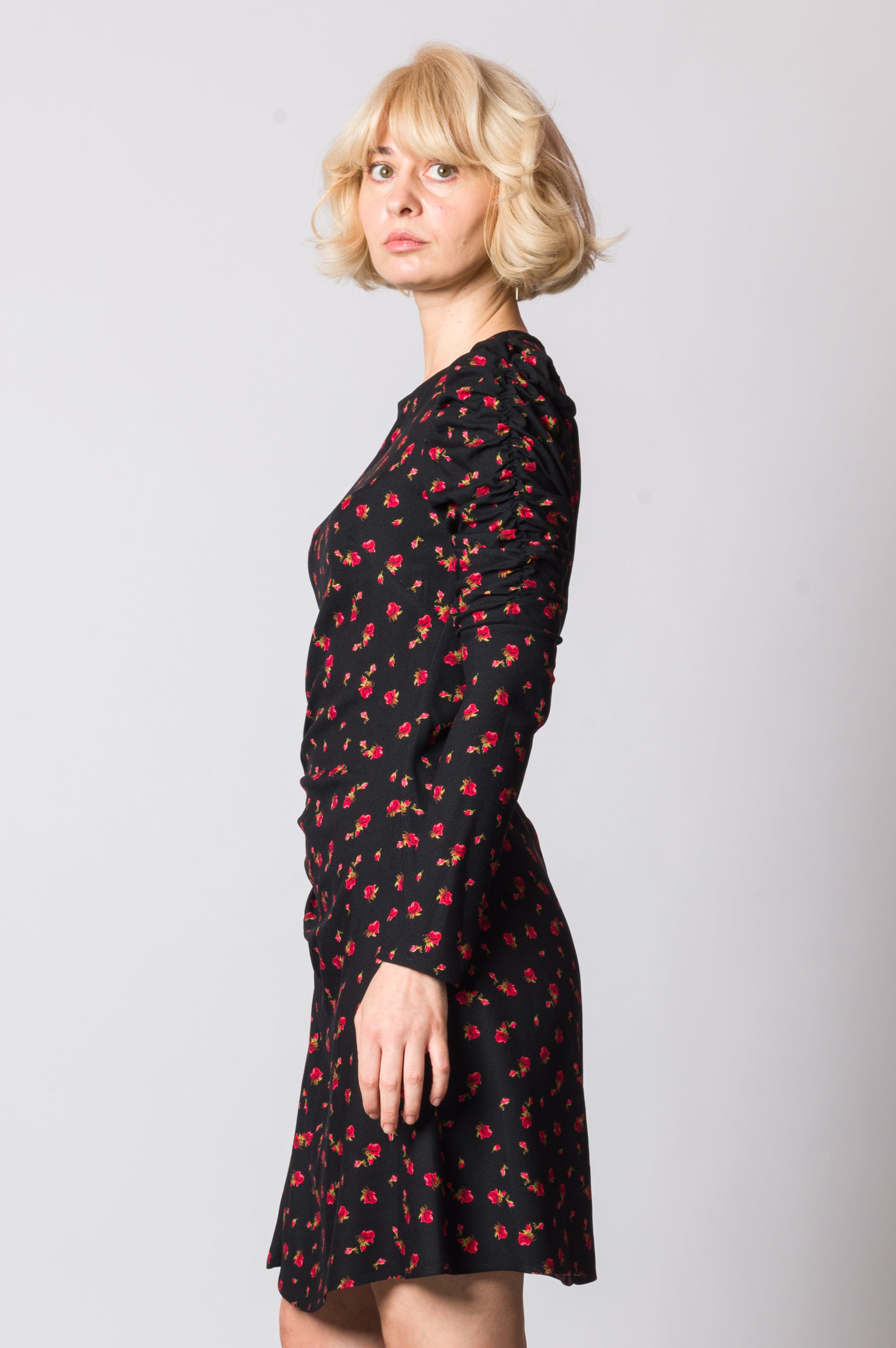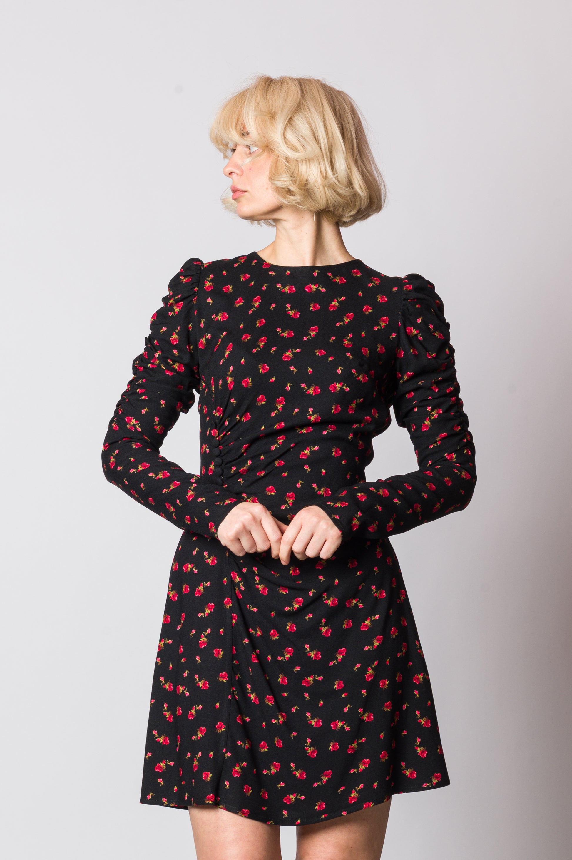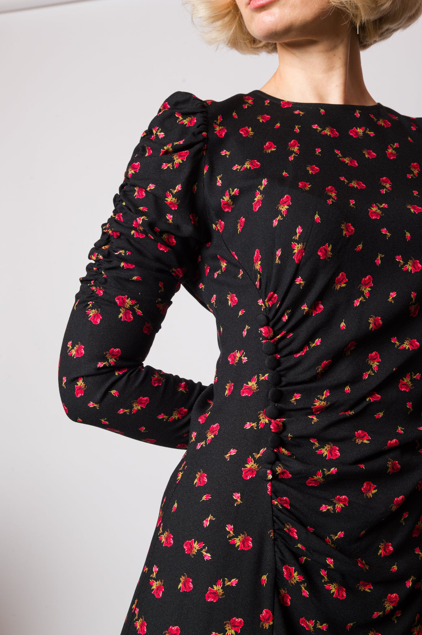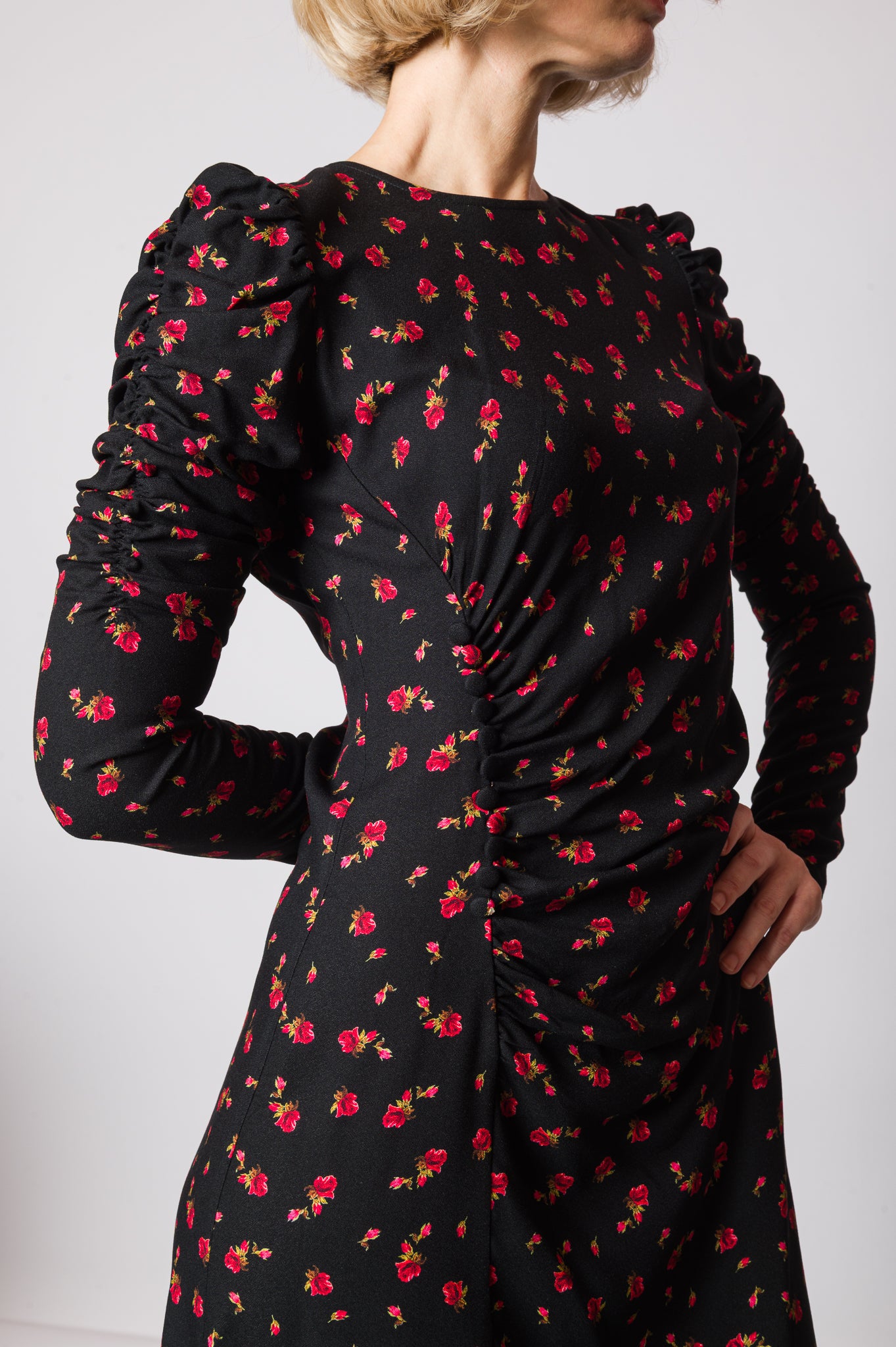 Il midi dress a fantasia rose è l’abito perfetto per chi ama la femminilità con dettagli unici e ricercati. Realizzato in un tessuto fluido che accompagna le linee del corpo, presenta un elegante drappeggio sul fianco destro che valorizza la silhouette e dona movimento. I bottoni laterali sul lato destro aggiungono un dettaglio sartoriale che rende il modello ancora più esclusivo. La chiusura con zip sul retro garantisce praticità, mentre la fantasia di rose conferisce un tocco romantico e sofisticato. Con la sua lunghezza midi e le maniche lunghe, è perfetto per occasioni speciali, serate eleganti o eventi in cui vuoi sentirti protagonista.