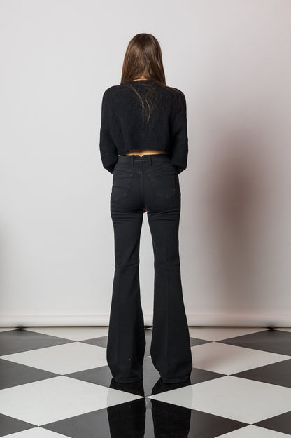 Modello flaire, tinto in capo vita alta, 5 tasche colore nero con passanti per cintura.