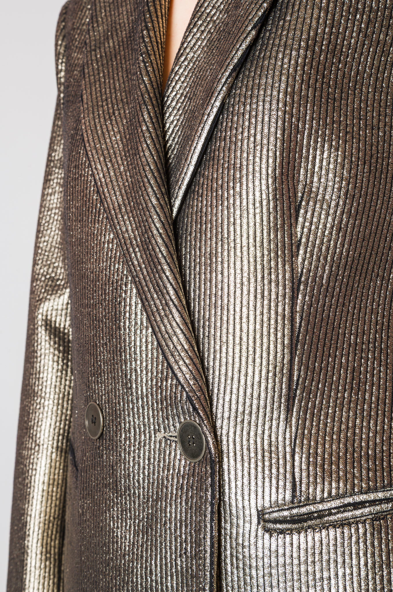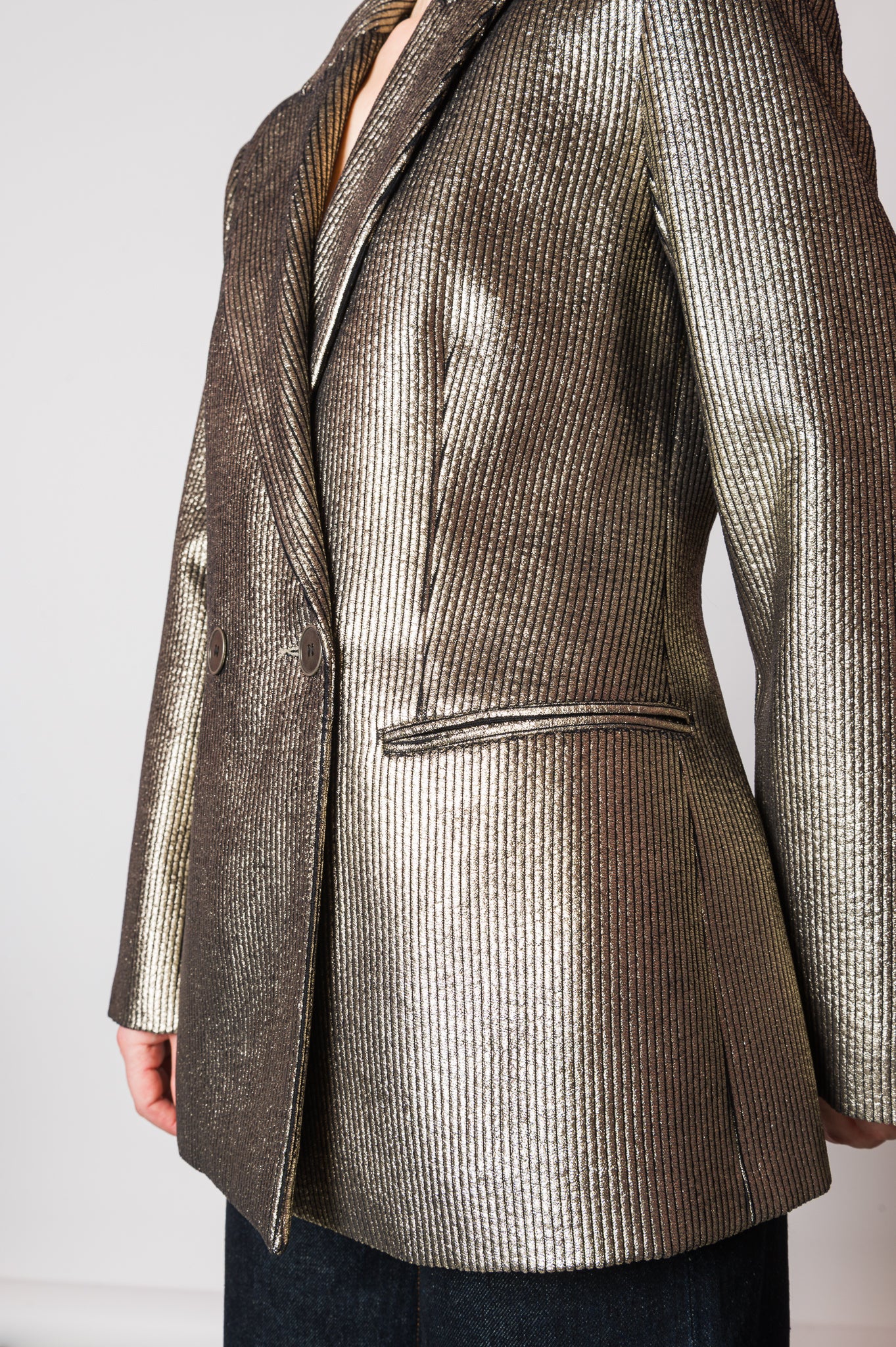 Un capo Made in Italy sofisticato e scenografico: la giacca doppiopetto in velluto con finitura oro è pensata per rendere unico ogni outfit. Il taglio doppiopetto con due bottoni slancia la figura, mentre le spalline leggermente imbottite donano struttura alla silhouette. Internamente è completamente foderata, garanzia di comfort e qualità. Le tasche a filo sul davanti aggiungono un tocco sartoriale, mentre la vestibilità slim accompagna con eleganza le linee del corpo. Un pezzo statement che illumina il look con riflessi preziosi: perfetta da indossare con pantaloni eleganti, gonne o denim scuro per un contrasto glam. La lavorazione oro sul velluto cattura la luce e dona carattere ad ogni occasione.