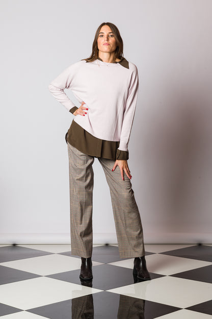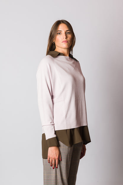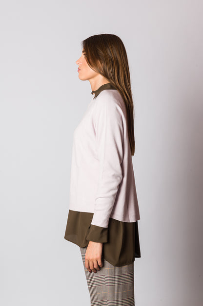 La maglia in lana, angora e viscosa color confetto è il capo perfetto per chi desidera unire comfort e raffinatezza. Grazie alla sua composizione pregiata, è leggera ma al tempo stesso calda, ideale per accompagnarti nelle giornate più fresche senza appesantire. La manica raglan dona una vestibilità morbida e confortevole, mentre lo scollo a barcaaggiunge un tocco femminile e raffinato. Il colore confetto, delicato e luminoso, rende questa maglia un must-have versatile, facile da abbinare sia a look casual chic con denim, sia ad outfit più eleganti con gonne o pantaloni sartoriali. Un capo morbido come una carezza, pensato per coccolarti con stile.
