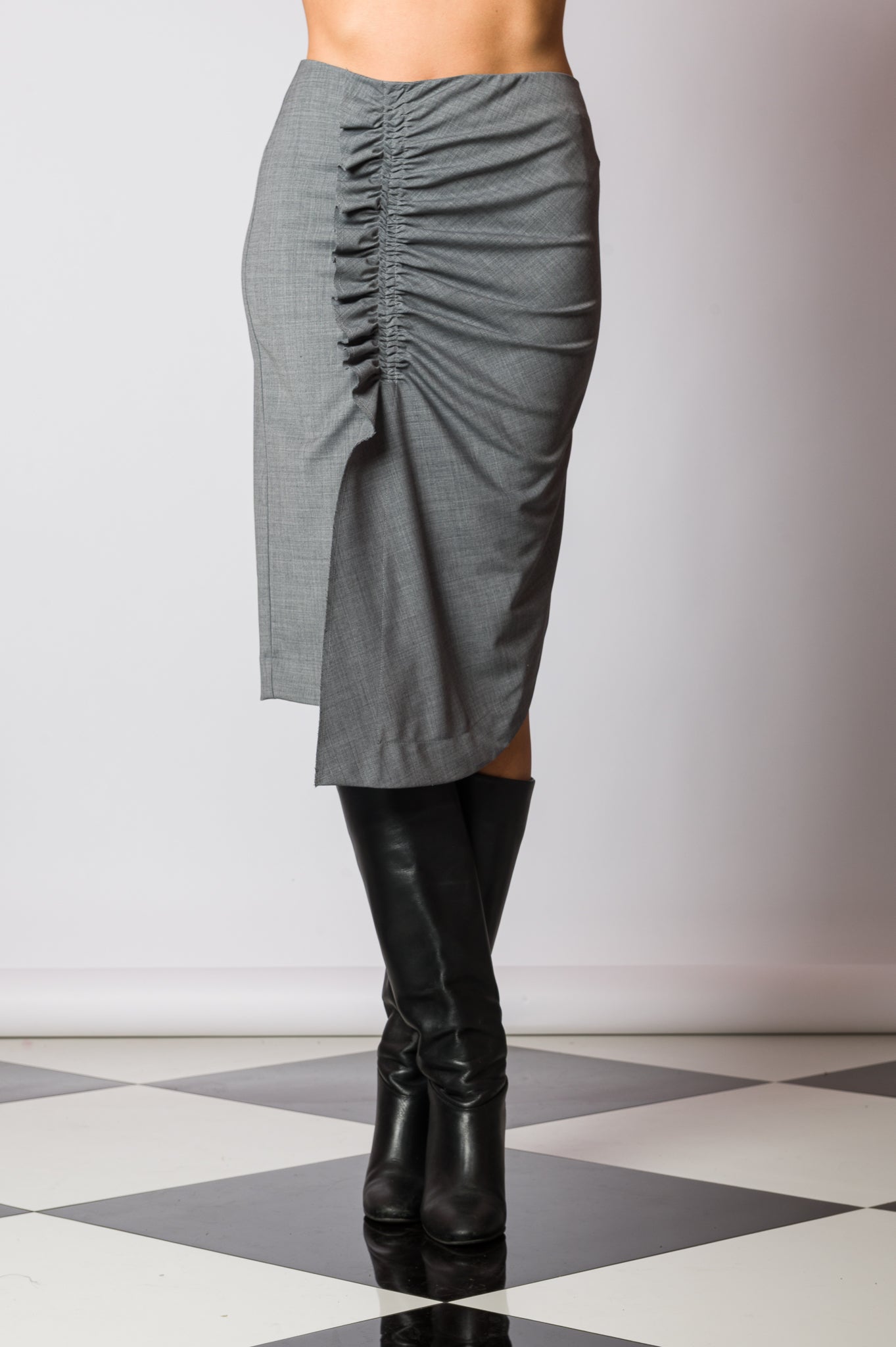 Elegante e contemporanea, la gonna Made in Italy in fresco di lana a vita alta è un capo che unisce raffinatezza sartoriale e dettagli femminili. Il modello presenta una linea dritta che segue la silhouette senza costringerla, arricchita da uno spacco laterale sul ginocchio destro che regala movimento e sensualità. La parte posteriore è leggermente stondata sulla sinistra, mentre l’arricciatura sulla coscia destra dona un gioco di drappeggi elegante e armonioso. La chiusura con zip posteriore invisibile mantiene il design pulito. Un capo versatile che si abbina facilmente sia a camicie che a blazer sartoriali, perfetto per occasioni formali, serate o eventi in cui vuoi sentirti sofisticata e sicura di te.