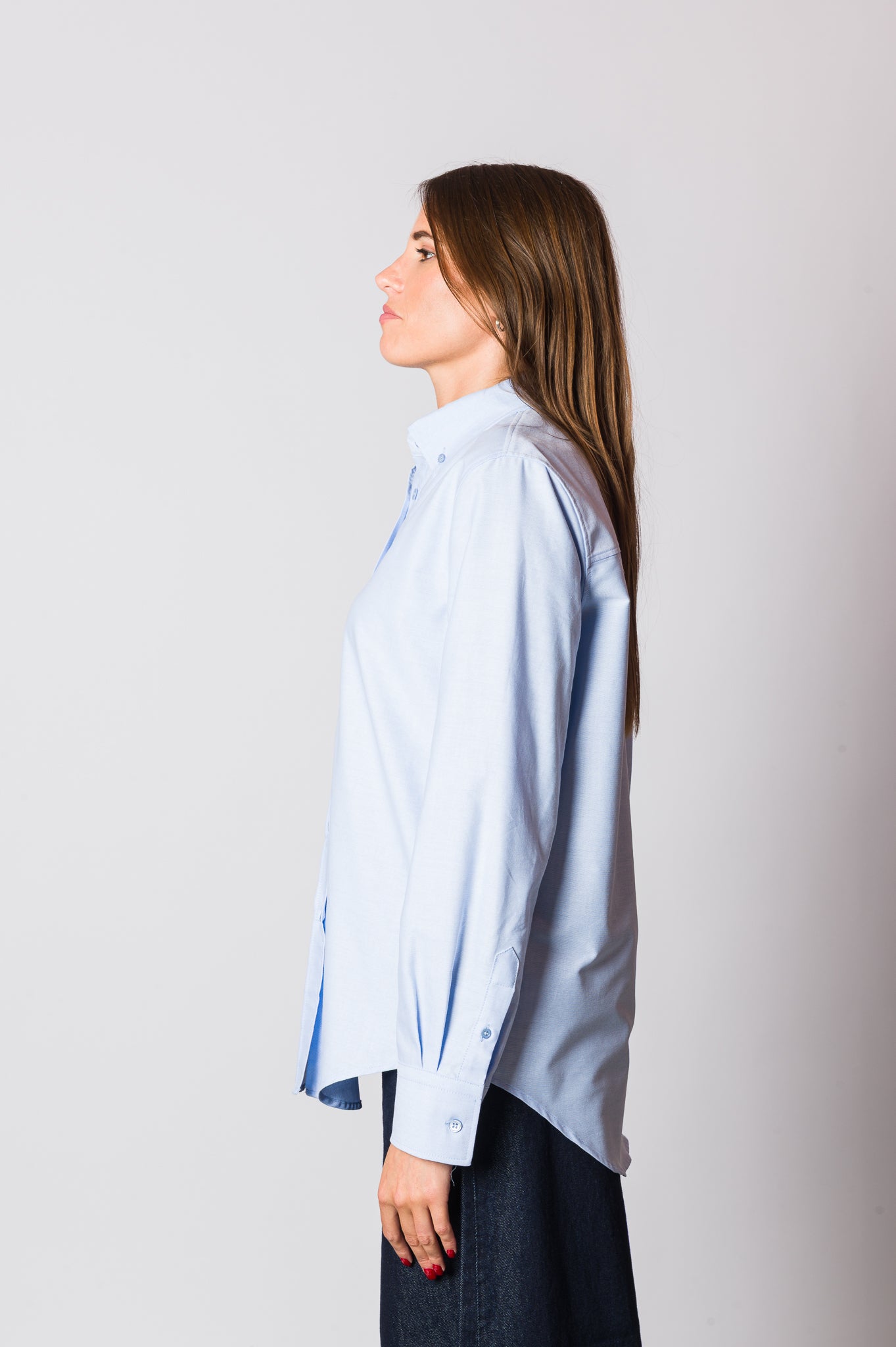 La camicia Oxford azzurra botton down è un evergreen del guardaroba femminile. Realizzata in tessuto Oxford, noto per la sua resistenza e texture elegante, unisce il fascino maschile della camiceria classica con un fit pensato per valorizzare la silhouette femminile. La vestibilità regular assicura comfort e libertà di movimento, mentre il colletto botton down la rende un capo intramontabile e sempre raffinato. Perfetta per look business sotto giacca, casual chic con maglioni o portata da sola per un’eleganza minimal.