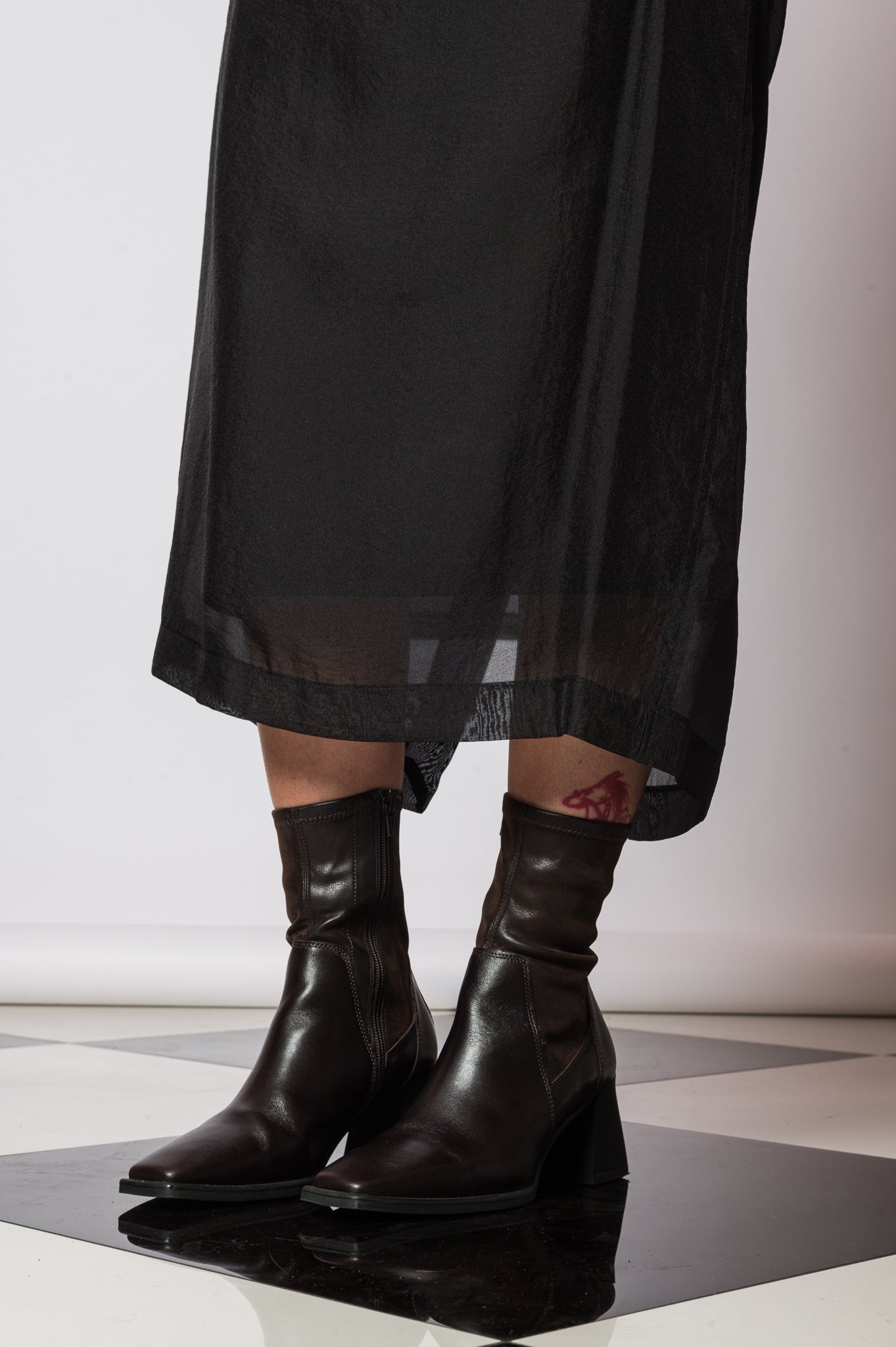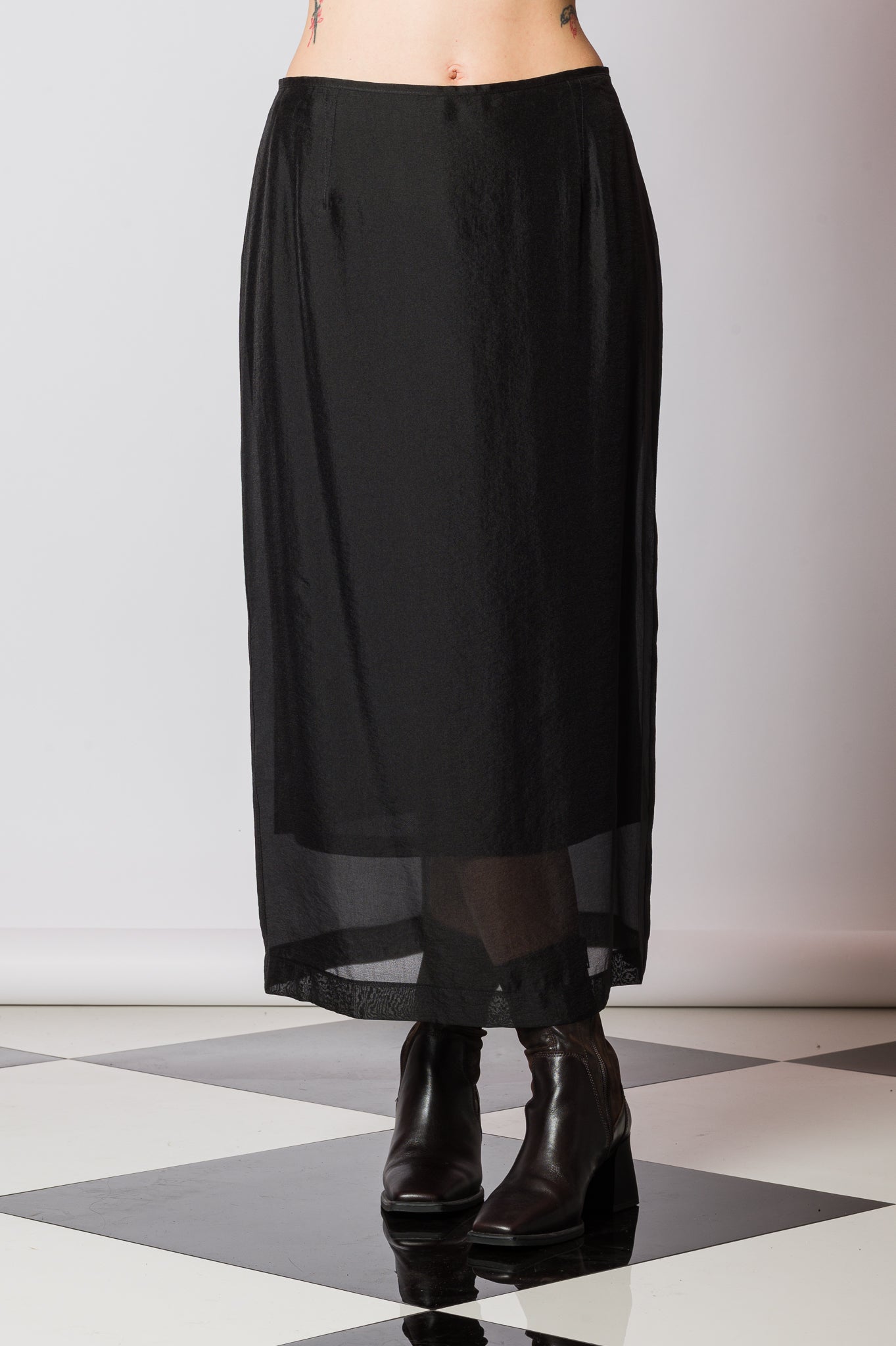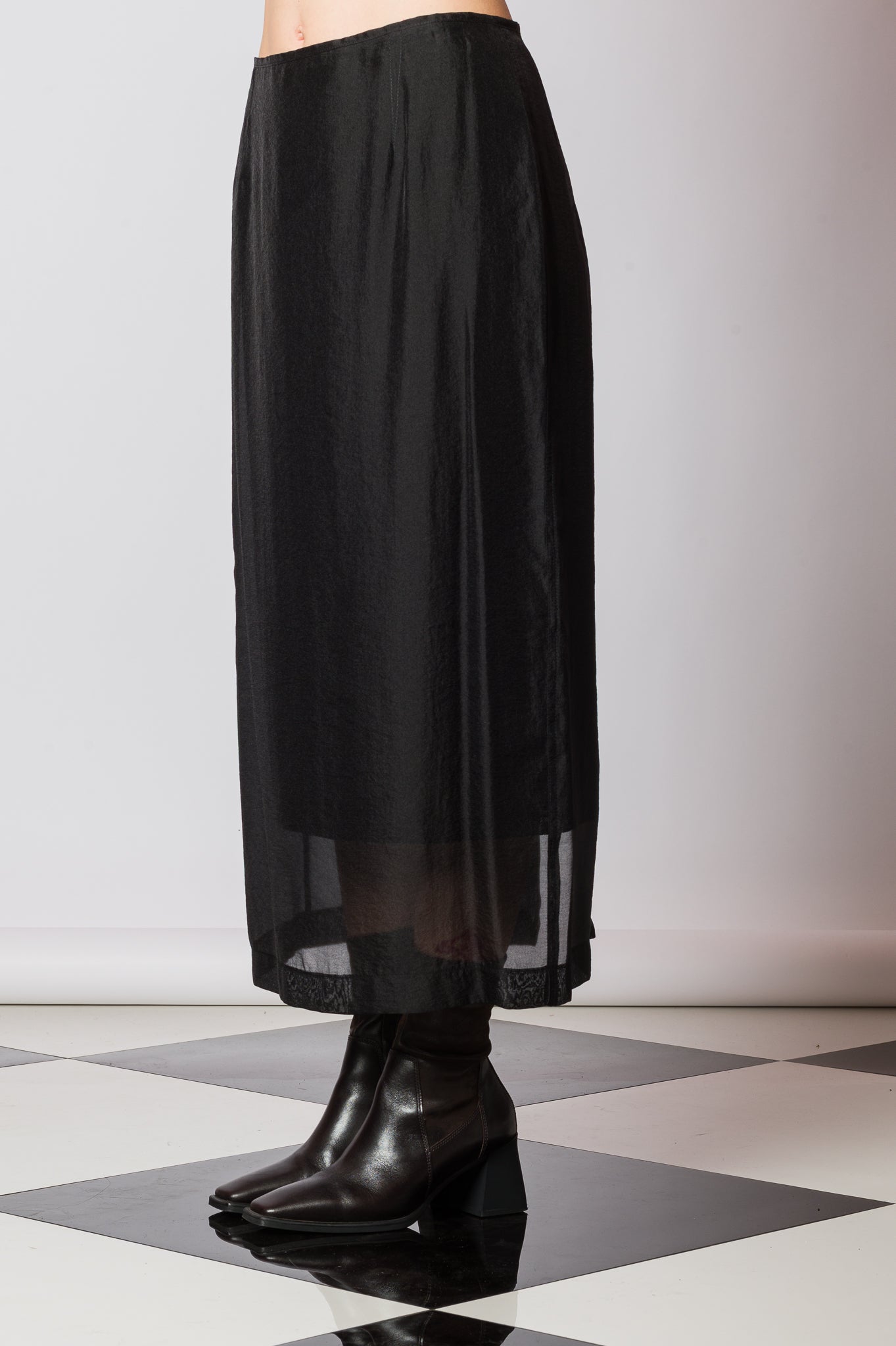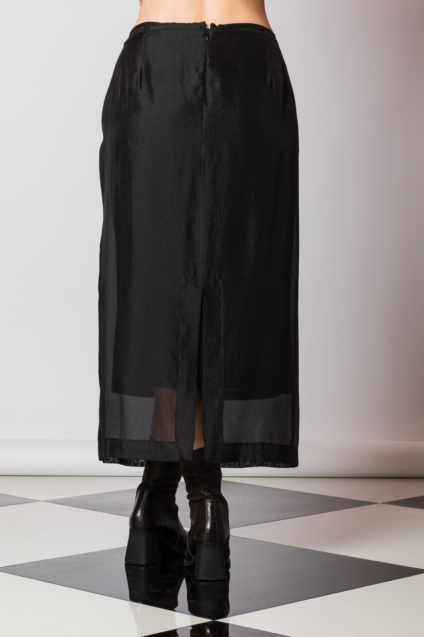 Un capo raffinato che unisce trasparenze leggere e design sartoriale: la gonna midi in organza nera è pensata per chi ama uno stile femminile e sofisticato. La sottoveste in tono assicura coprenza e comfort, senza rinunciare al fascino del tessuto leggero e impalpabile. Lo spacco posteriore dona movimento e sensualità, mentre la chiusura sul retro mantiene il design pulito ed elegante. Perfetta con top essenziali, camicie in seta o blazer dal taglio maschile per un contrasto di stile, è una gonna versatile che accompagna sia occasioni speciali che outfit da sera di forte personalità.