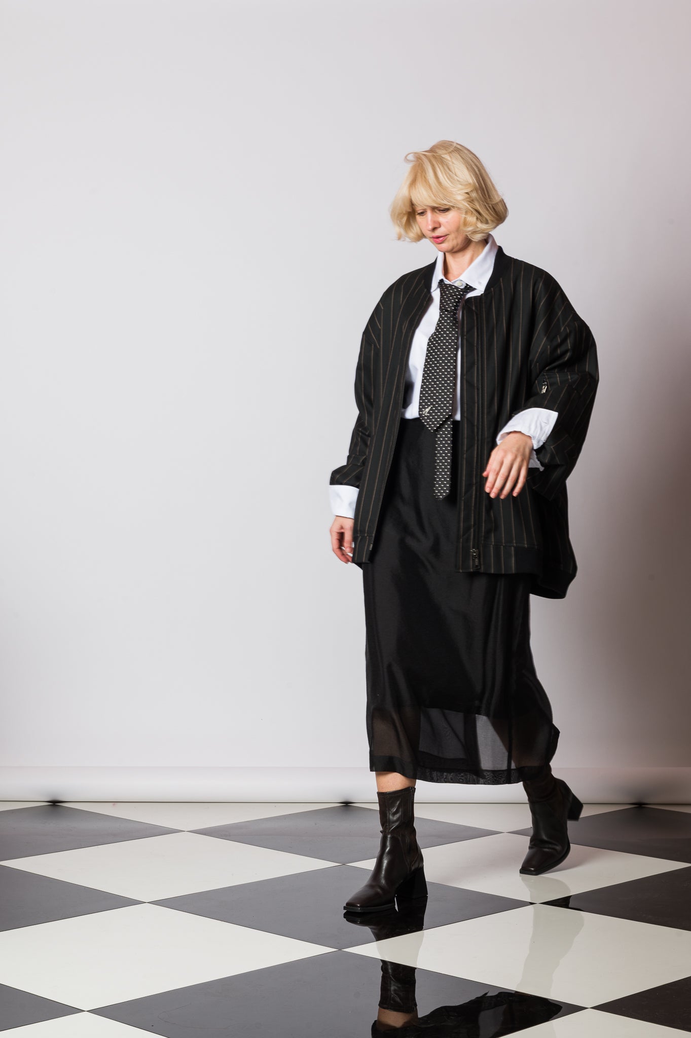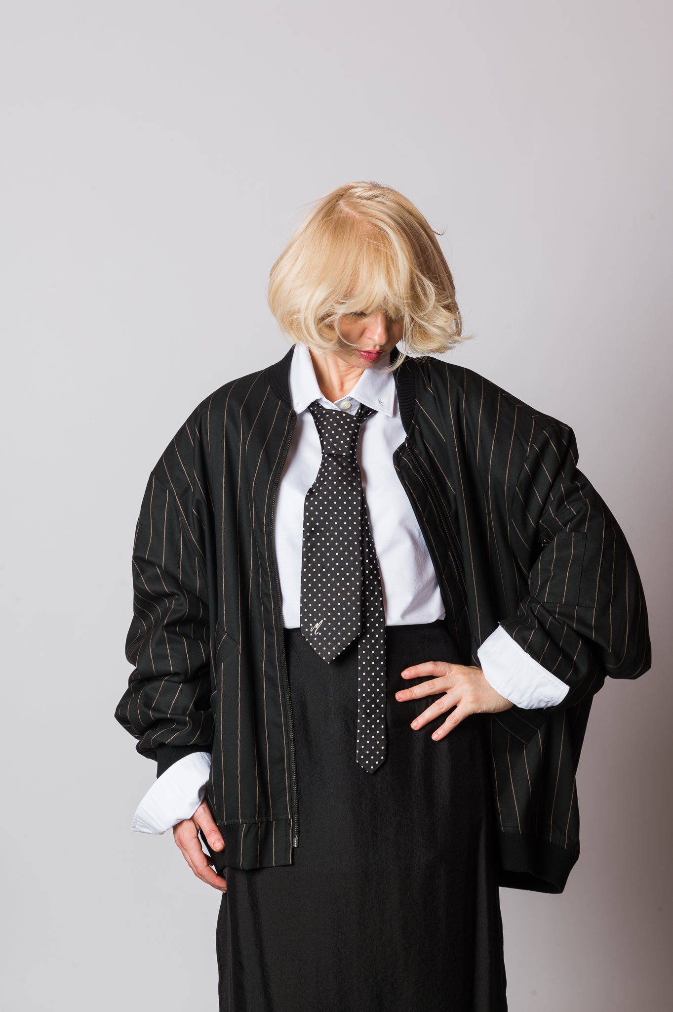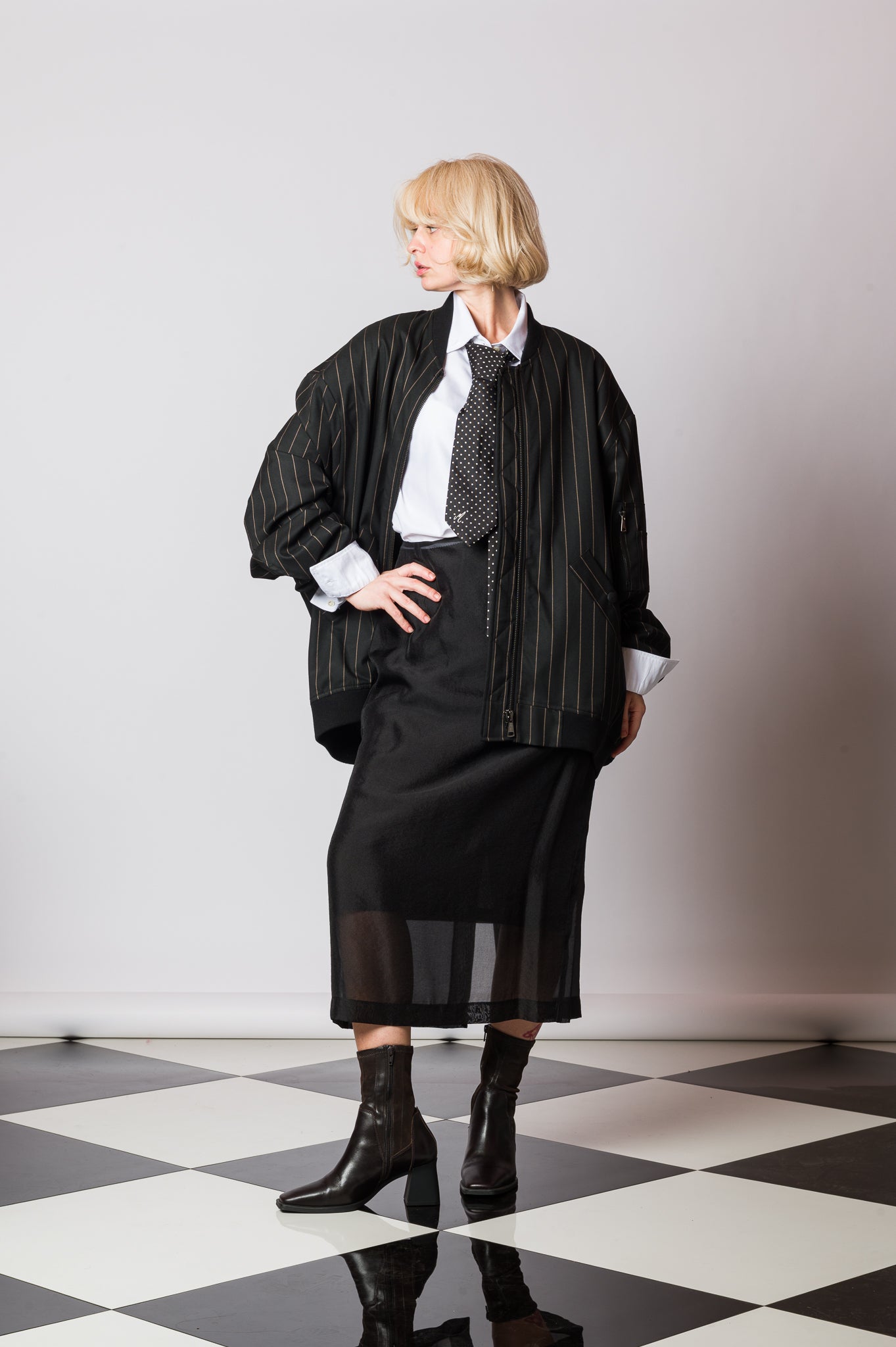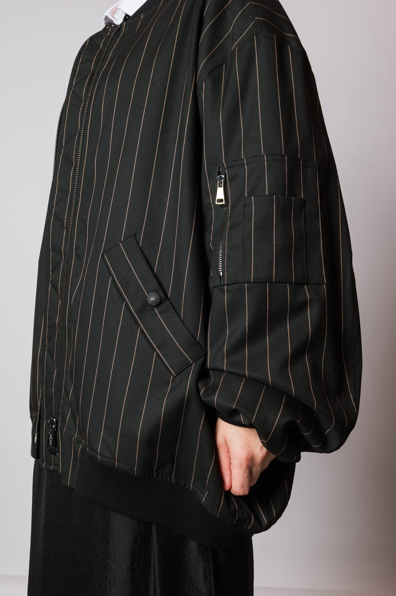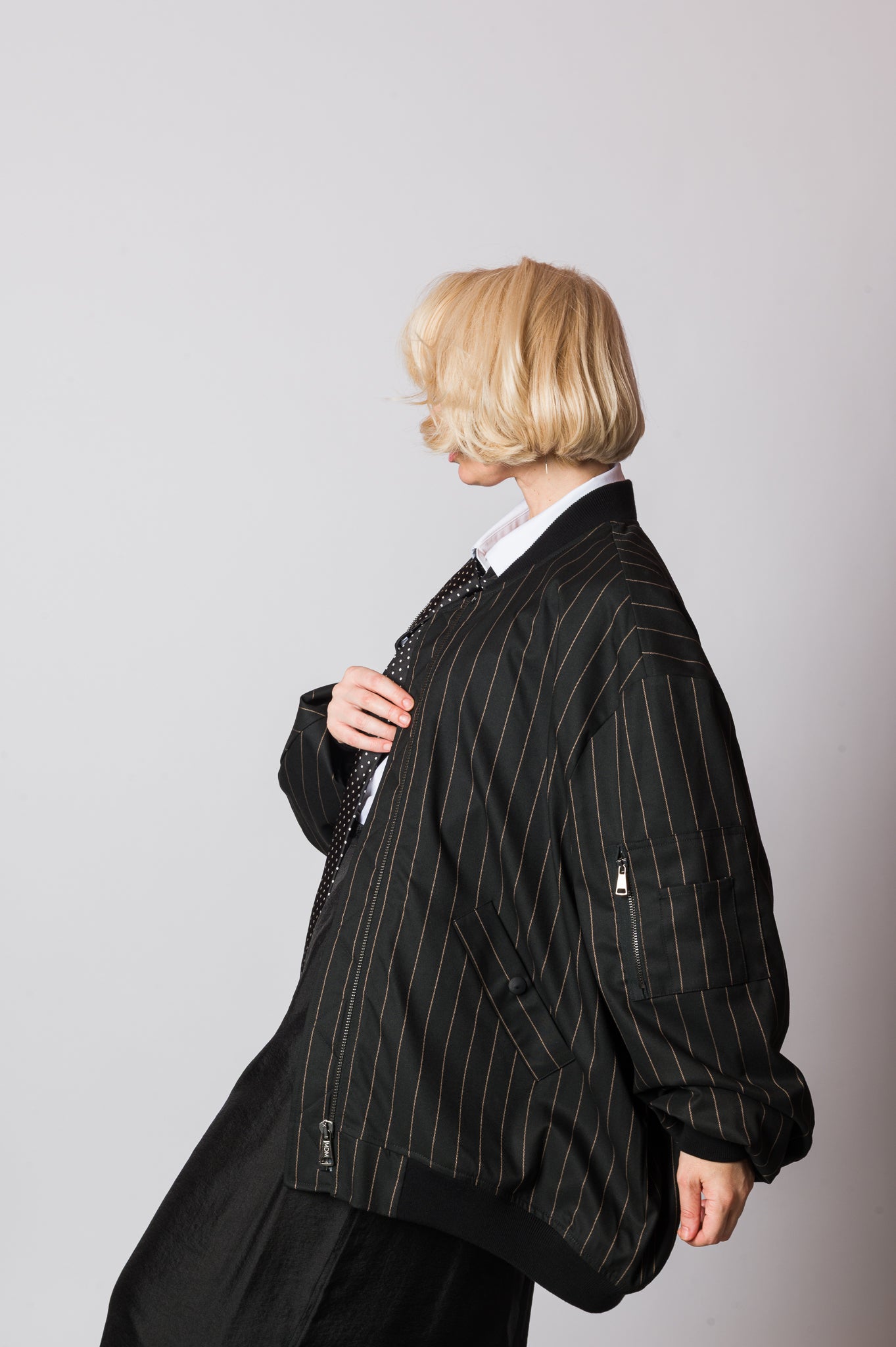 Il bomber over gessato nero Made in Italy è la reinterpretazione contemporanea di un classico dello streetwear. Realizzato in un tessuto dal taglio sartoriale con motivo gessato, fonde eleganza maschile e praticità quotidiana. Il design over regala comfort e modernità, mentre la zip centrale assicura una chiusura pratica e veloce. Le tasche frontali con bottoni a pressione aggiungono funzionalità, e la tasca con zip sulla manica sinistra richiama lo stile iconico dei bomber più autentici. Perfetto da indossare con denim e sneakers per un look urban, o da abbinare a pantaloni sartoriali per un contrasto sofisticato e di tendenza.